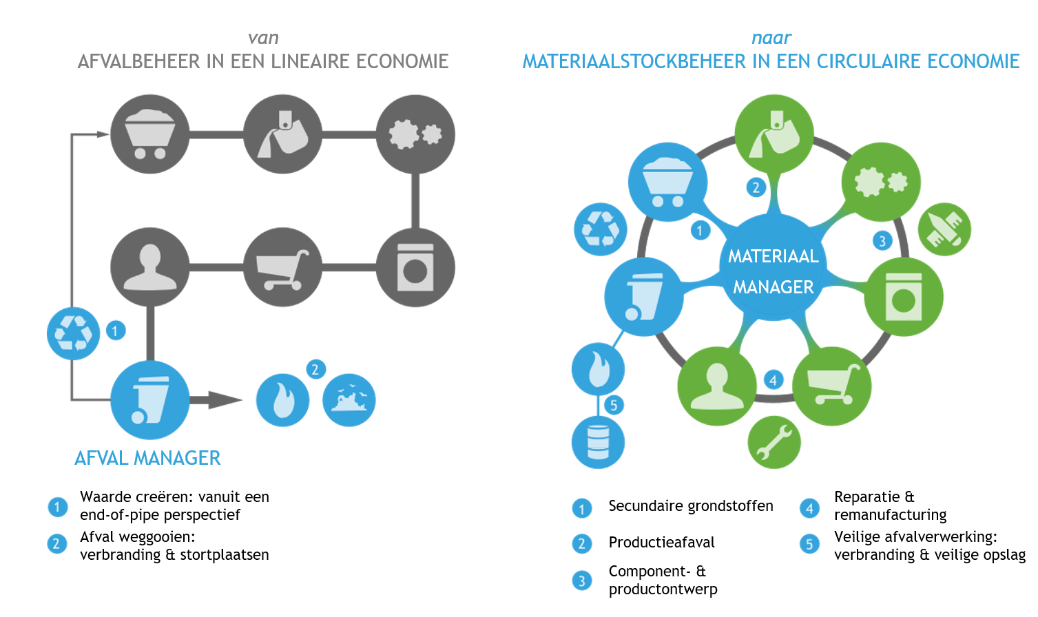 We verleggen de focus afvalbeheer naar materiaalstockbeheer. Dit laat ons toe om op grote schaal hergebruik, reparatie en recyclage in het ontwikkelingsproces te brengen of sterk te verbeteren, en zo het gebruik van primaire grondstoffen terug te dringen.