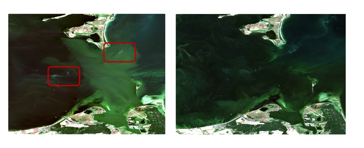 True colour image (lleft) of the Bay of Greifswald acquired on 07/08/2018.